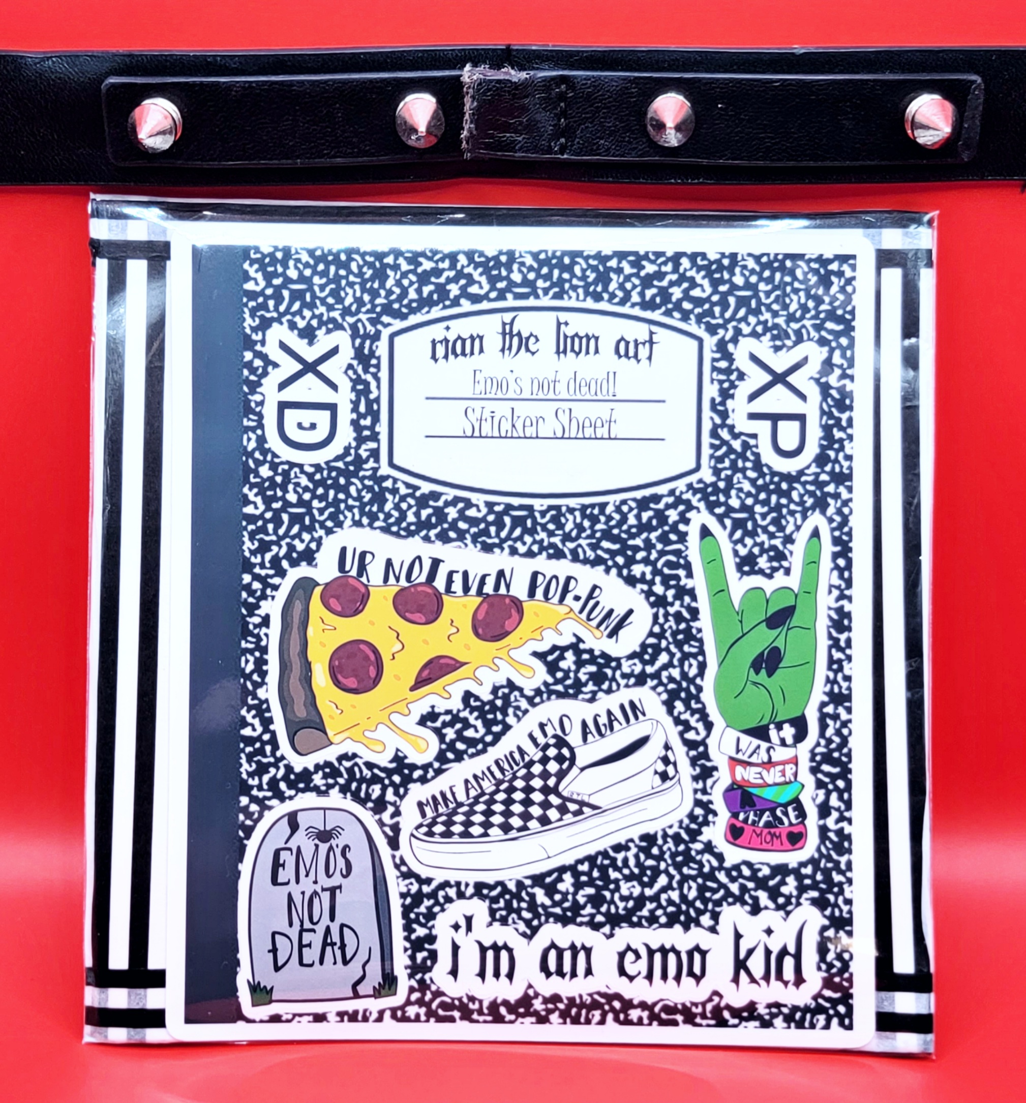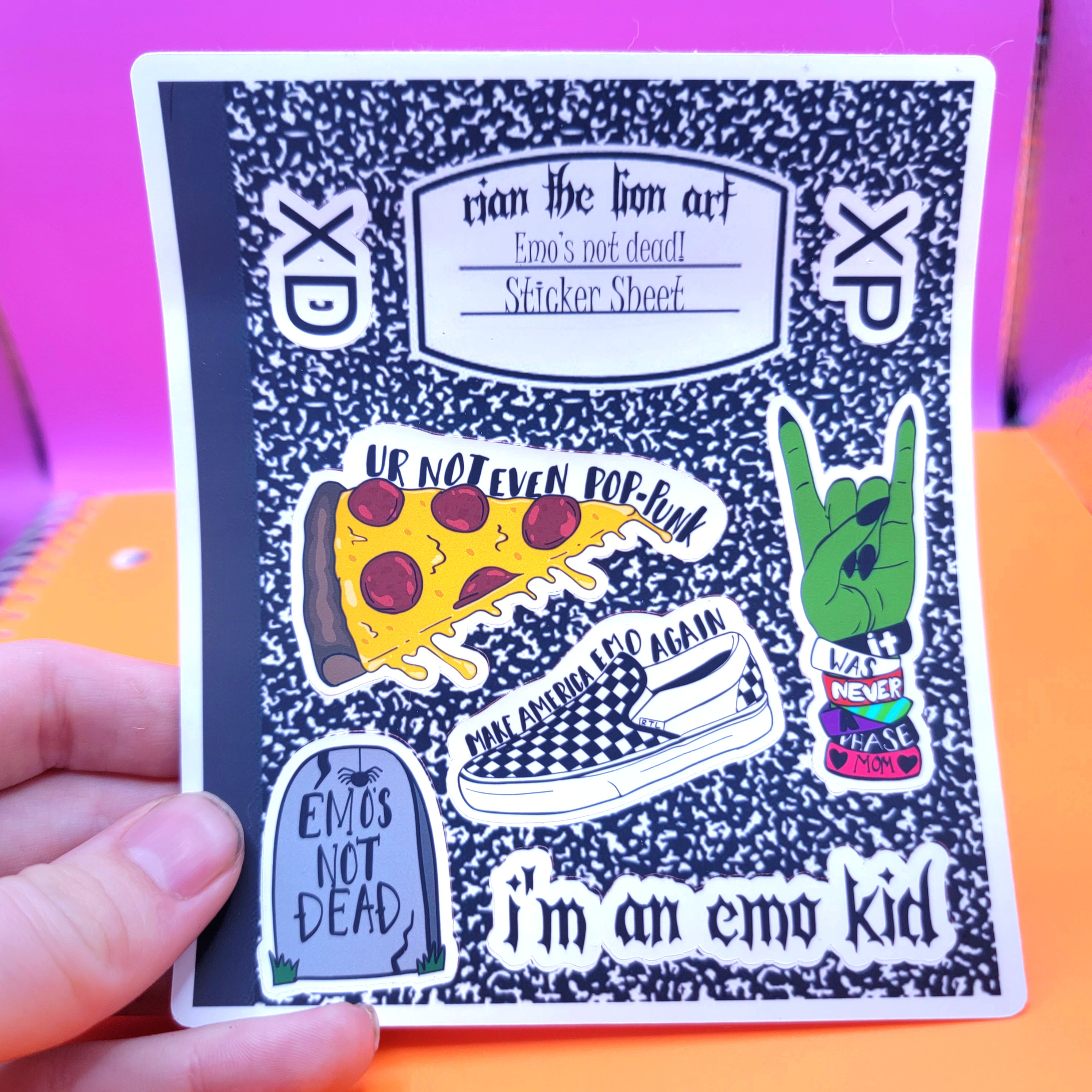 Remember when we were young and they had those sticker sheets you could get from the dollar store? Theyd have various kids cartoons or animals on them? Well what if they were emo/punk themed instead? Heal your inner child with this sticker sheet <3